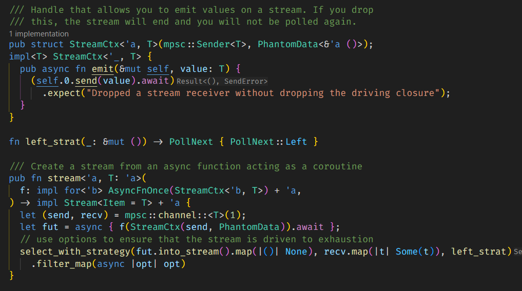lorentz1534515h@Lensflare Well, in an async context you don't ever need a generator because you can do the same thing with a parallel task and an unbuffered SPSC channel that prevents the sender from continuing until the current message has been received. That's what the snippet on the picture I linked does.